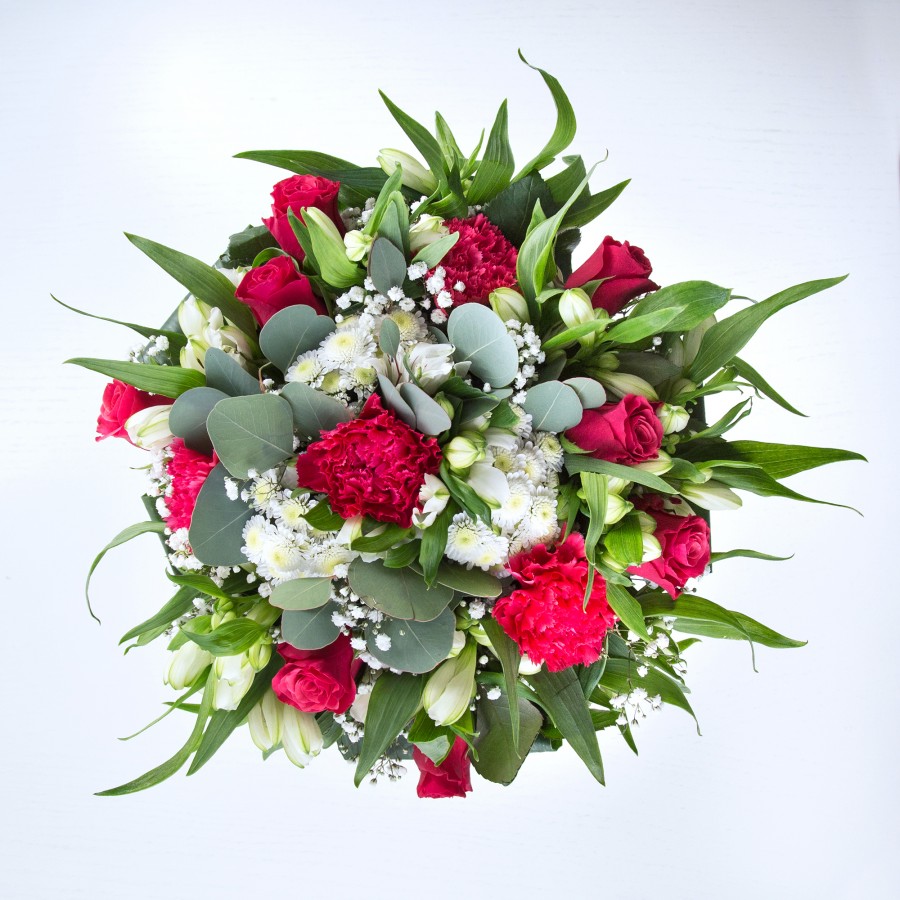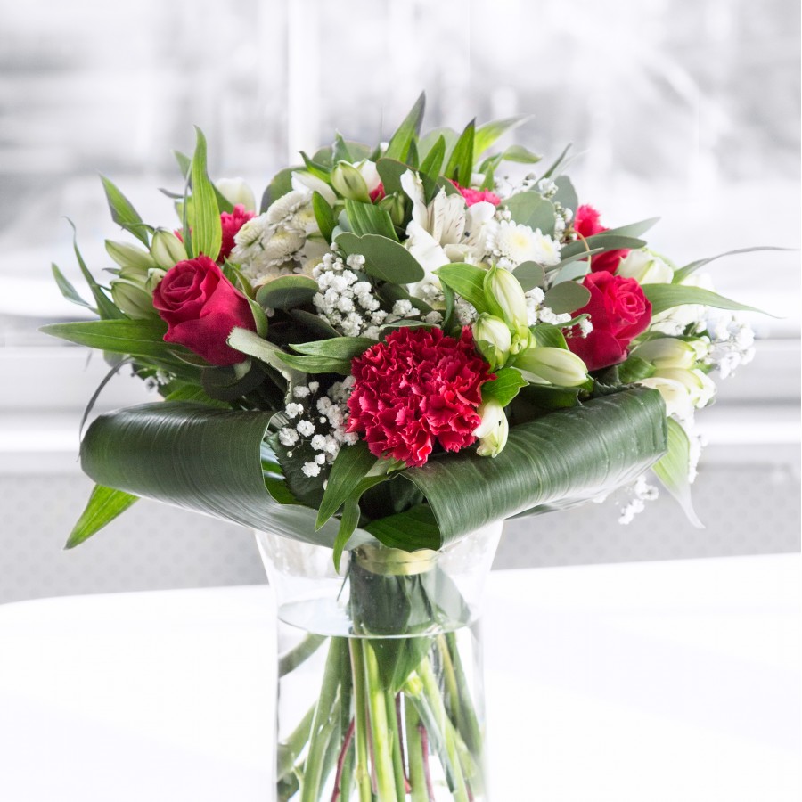 Embrace the timeless beauty of our bouquet, featuring luxurious red roses combined with sweet white chrysanthemums and gypsophila. The exquisite design is enhanced with white alstroemeria and aspidistra leaves, creating a sophisticated and unique floral display.