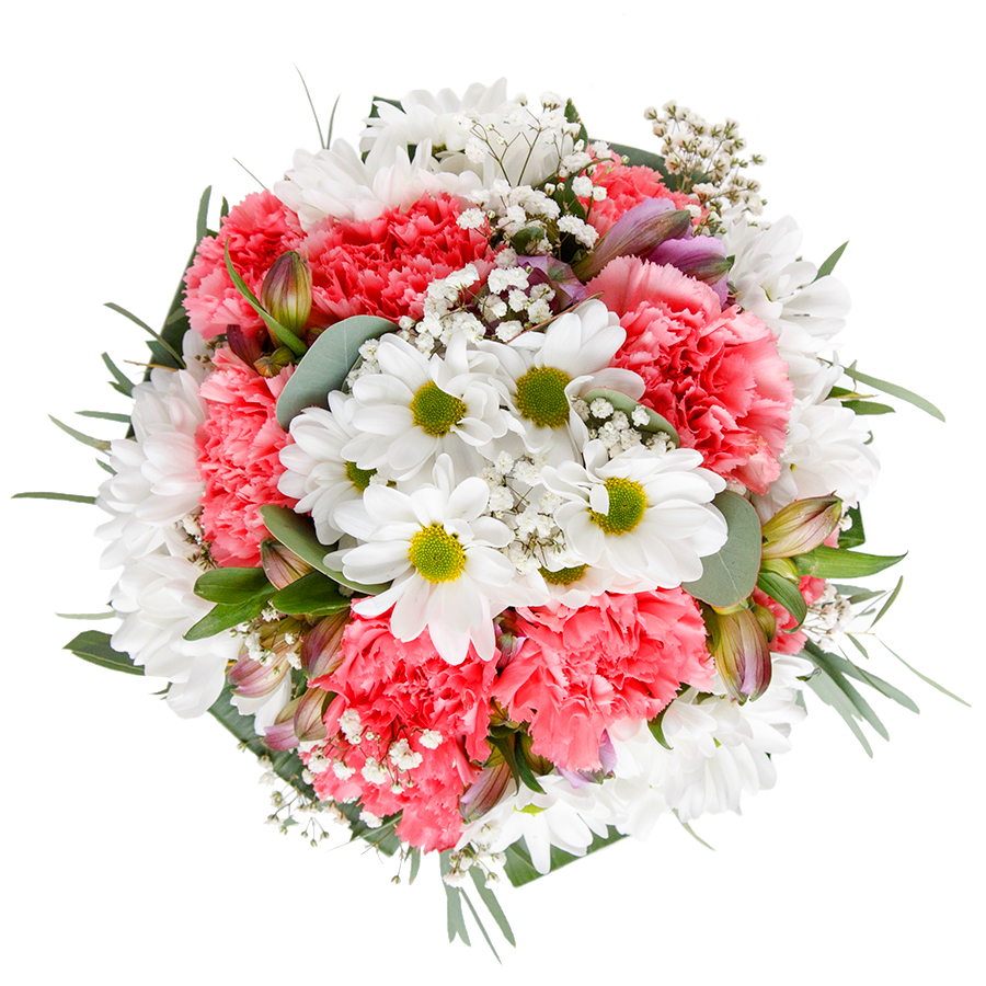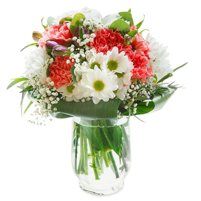 Bring elegance and joy with our delicate floral ensemble, thoughtfully arranged to highlight the beautiful colors and unique textures of each bloom. This bouquet features snow-white chrysanthemums, soft gypsophila, charming light pink carnations, and lush aspidistra leaves, all hand-selected for utmost freshness and quality.